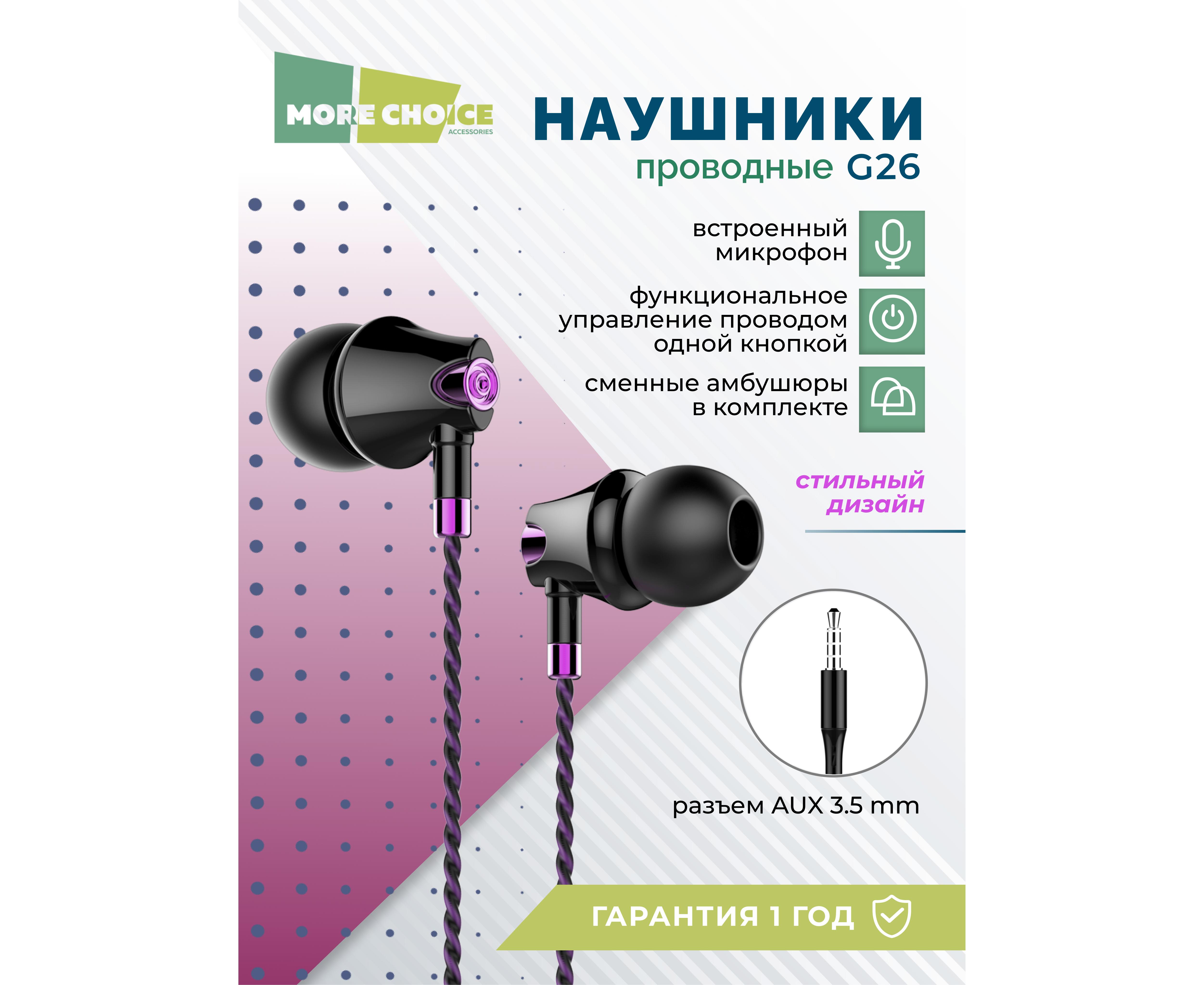 Наушники вакуумные AUX разъём с МК без рег.громкости длина 1.1м More Choice G26 (Purple)