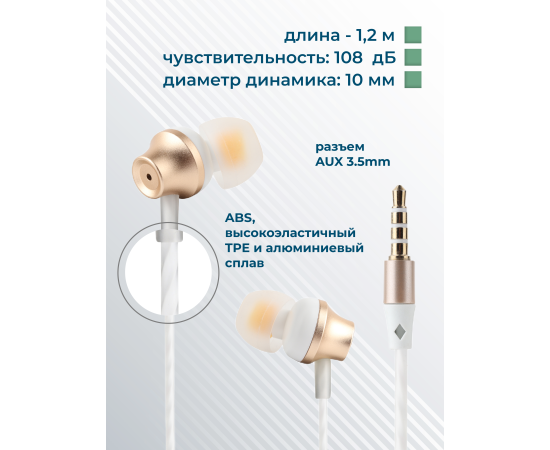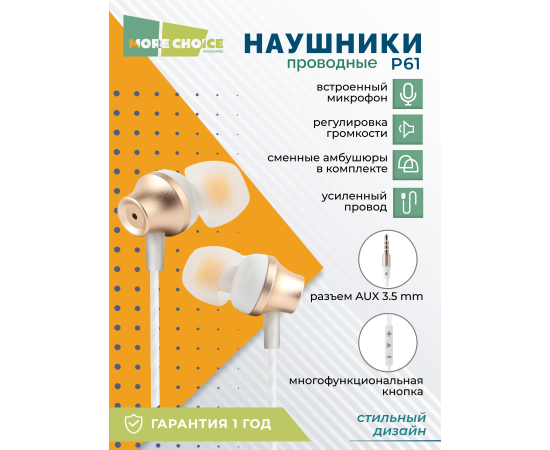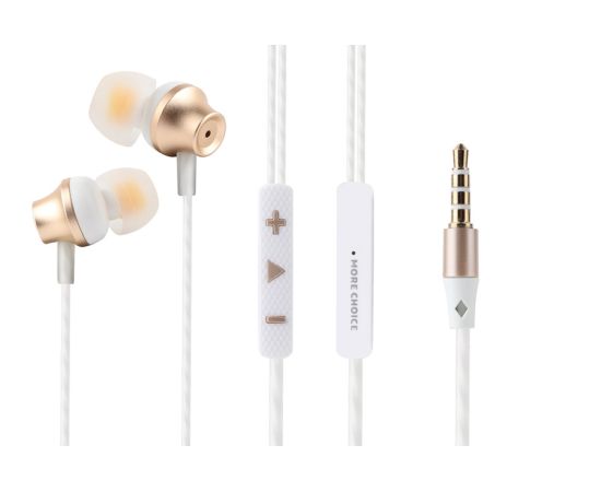 Наушники вакуумные AUX разъём с МК и рег.громкости длина 1.2м More Choice P61 (White Gold)