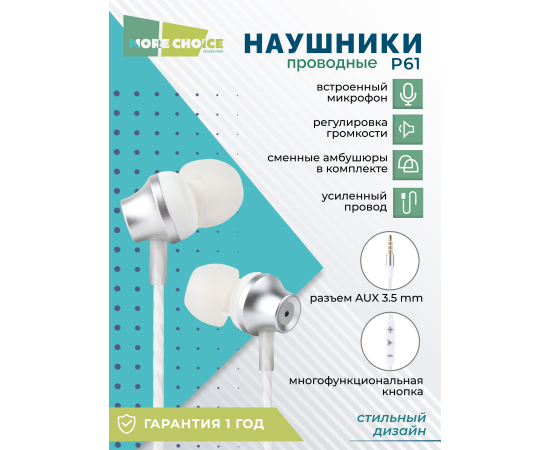 Наушники вакуумные AUX разъём с МК и рег.громкости длина 1.2м More Choice P61 (White Silver)