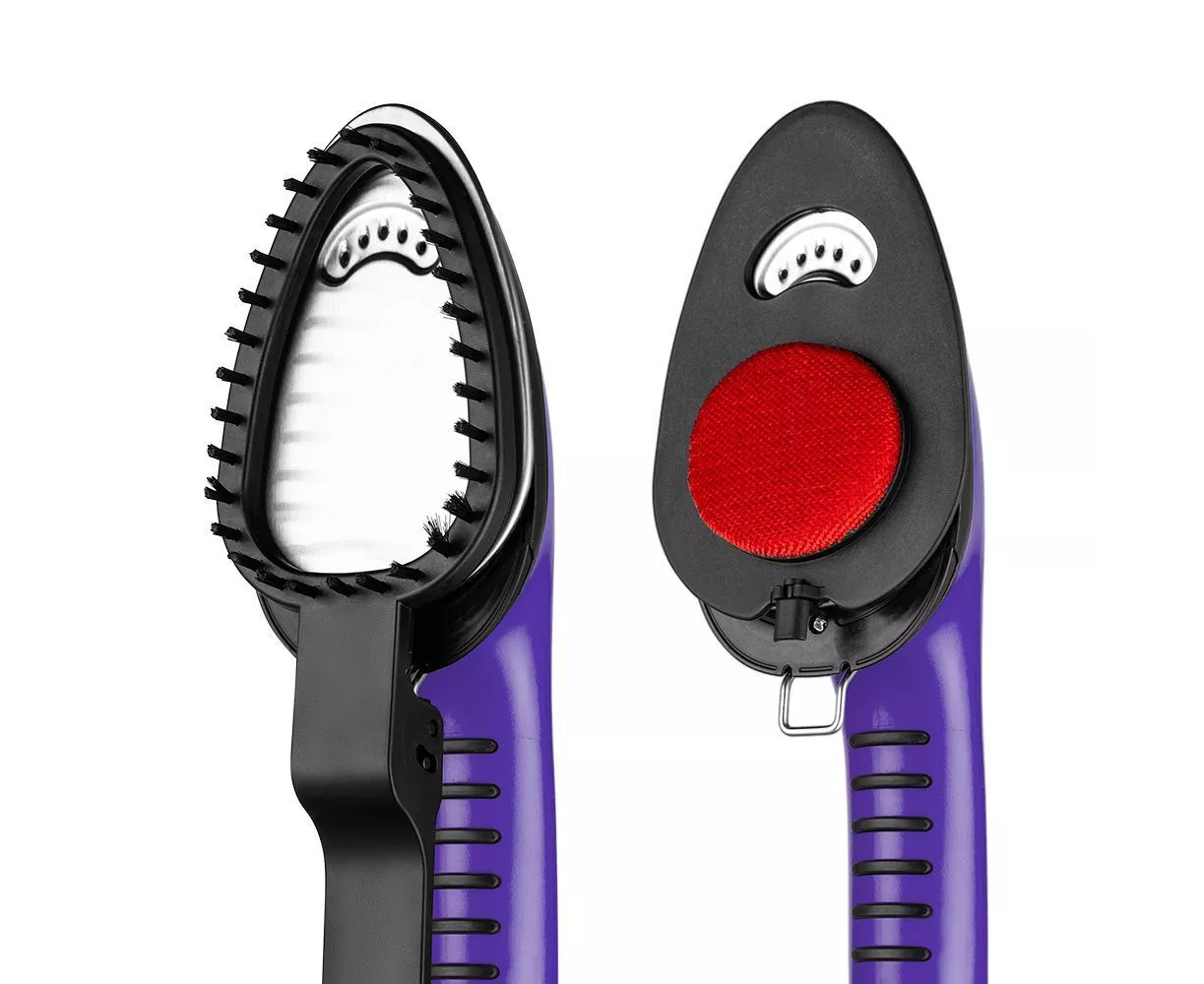 В комплекте с отпаривателем идут 2 насадки. Ворсовая насадка-зажим убирает шерсть домашних животных, волосы, ворс, а также помогает прогладить стрелки на брюках. Насадка из микрофибры необходима при работе с деликатными тканями.