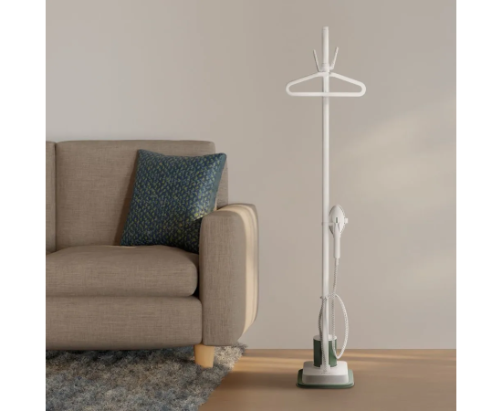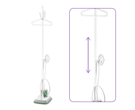 Отпариватель имеет небольшой корпус и удлинительные трубки, которые позволяют настроить удобную высоту устройства. Утюжок закрепляется в держателе между трубками. Корпус оснащён колёсиками для перемещения. Длина парового шланга — 1,4 метра.
