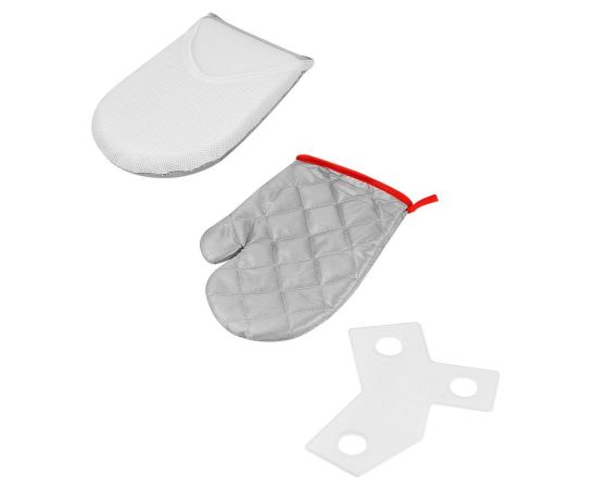 В комплекте идут две защитные варежки и дощечка для глажки, с помощью которой вы сможете прогладить мелкие детали, такие как манжеты или воротник рубашки.