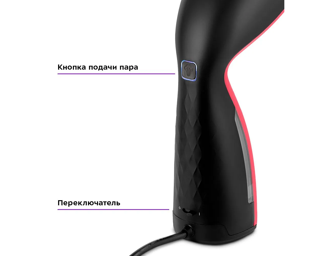 Переключать снизу включает и выключает устройство. После включения, спустя 30 секунд, вода нагреется, и вы можете приступать к отпариванию вещи. Нажмите и удерживайте кнопку подачи пара - пар начнёт выходить из паровых сопел.