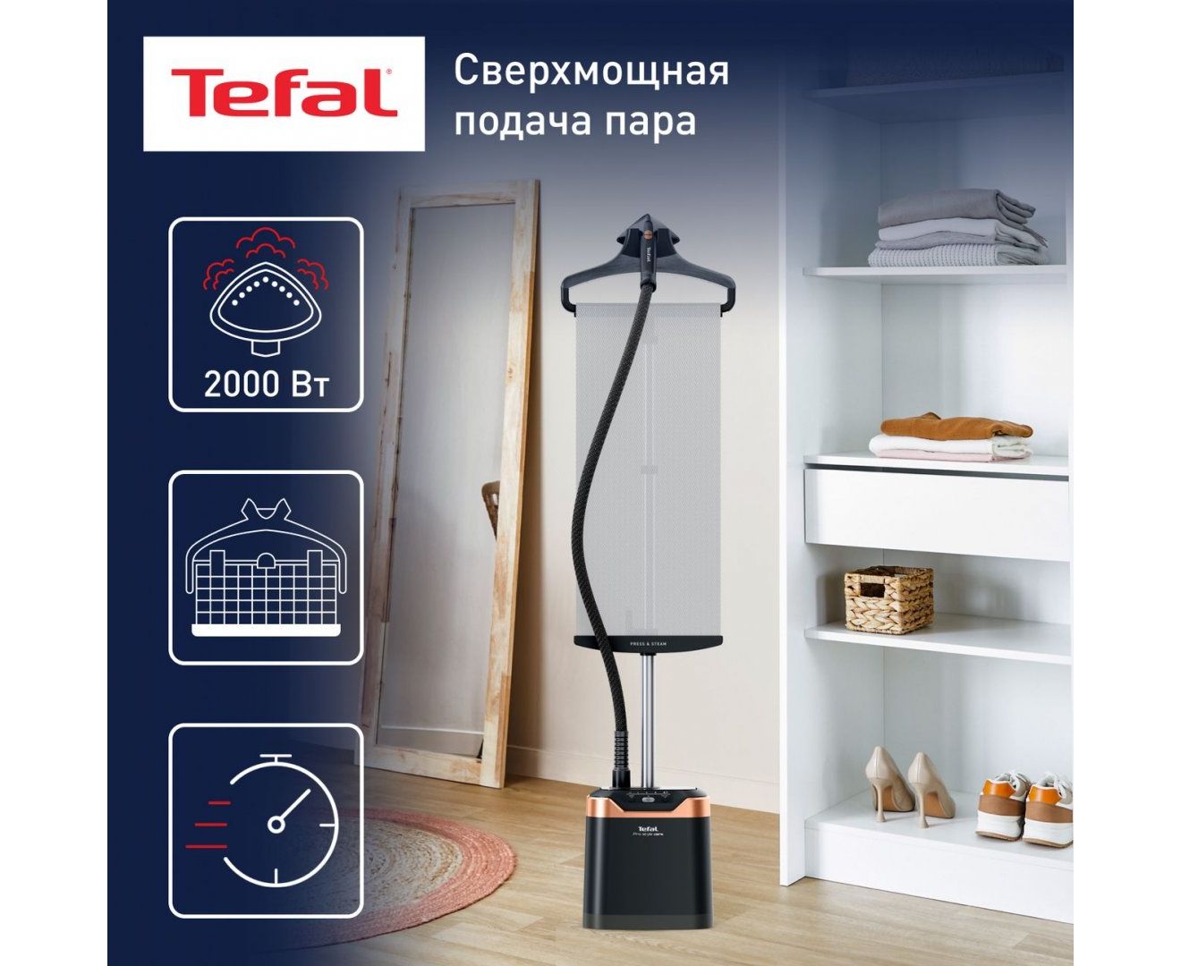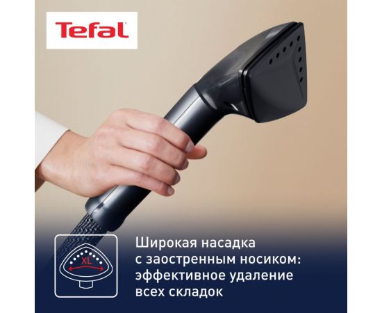 Для фиксации текстильных изделий модель оснащена вешалкой. Благодаря противокапельной системе на вещах не образуются мокрые пятна. Вертикальный отпариватель Tefal IT8480E1 мощностью 2000 Вт готов к использованию через 45 секунд после включения. Для обработки большого количества одежды без остановки в устройстве предусмотрен резервуар для воды объемом 1,3 л. Съемная конструкция облегчает наполнение. Регулируемая по высоте телескопическая стойка делает процесс отпаривания более удобным. Для безопасной эксплуатации в комплекте поставляется термостойкая рукавица.