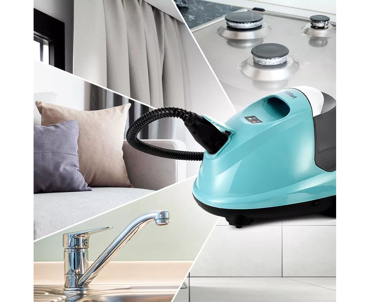 На корпусе пароочистителя есть ручка для переноски. Колёса позволяют с лёгкостью перемещать пароочиститель, не поднимая его. КТ-9187 предназначен для уборки полов и поверхностей, находящихся как внутри, так и вне помещений.