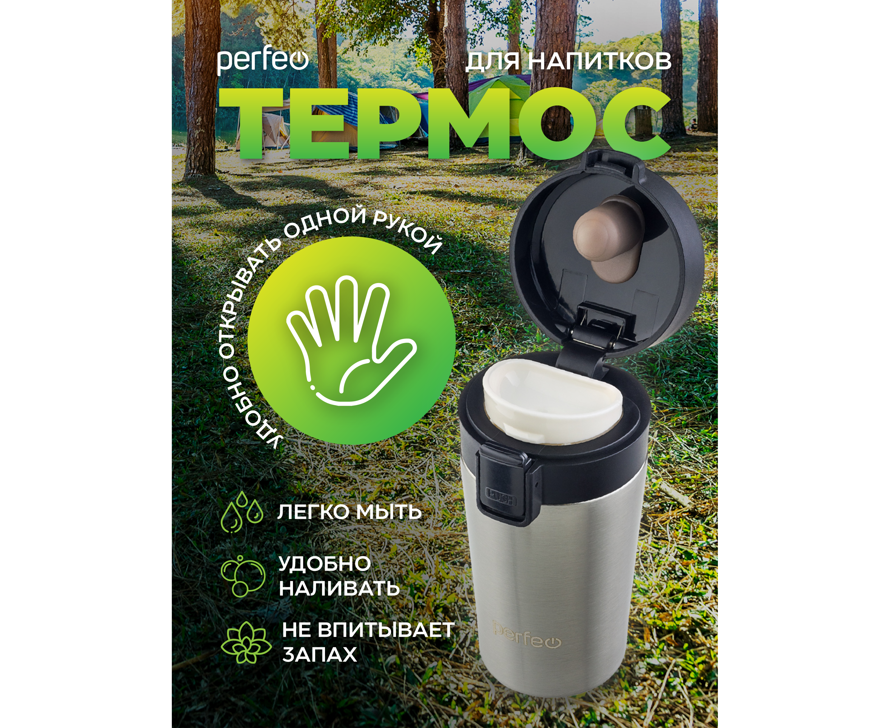 Термокружка для напитков PERFEO с крышкой-поилкой, ситечком, объем 0,25 л., нержавеющая сталь (PF_C3727)