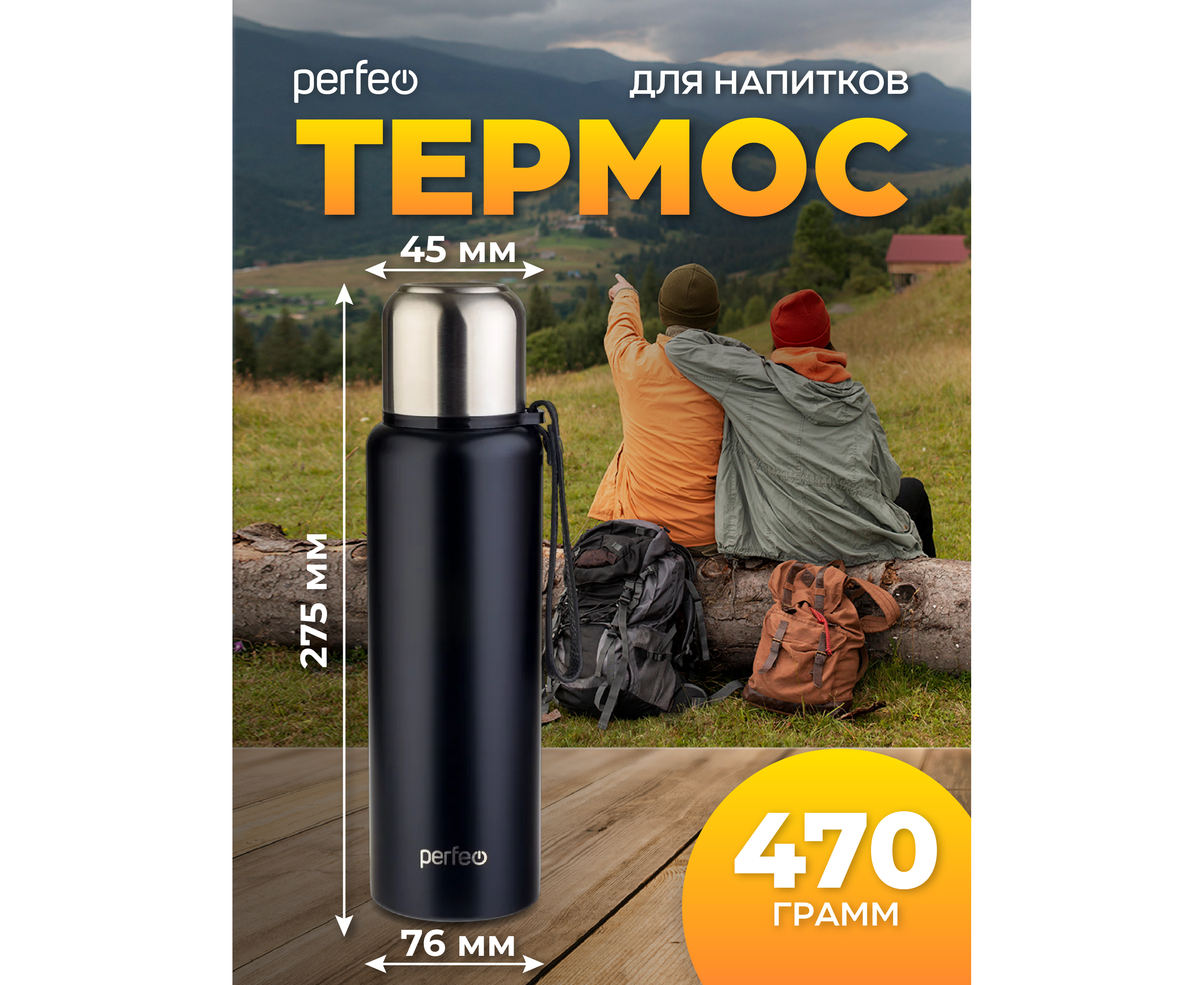 Термос для напитков PERFEO с глухой пробкой, ситечком, ремешком, объем 0,8 л., черный, (Арт. PF_C3705)