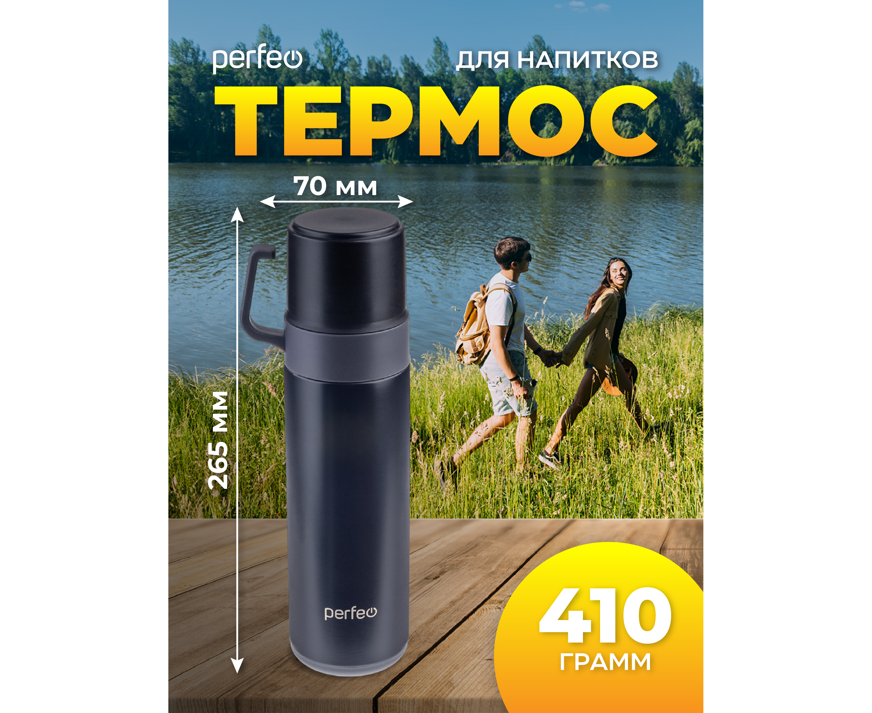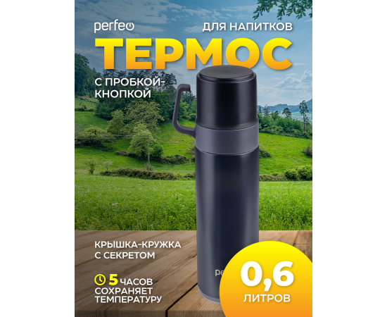 Термос для напитков PERFEO с пробкой-кнопкой, кружкой, объем 0,6 л., черный, (Арт. PF_D0204)