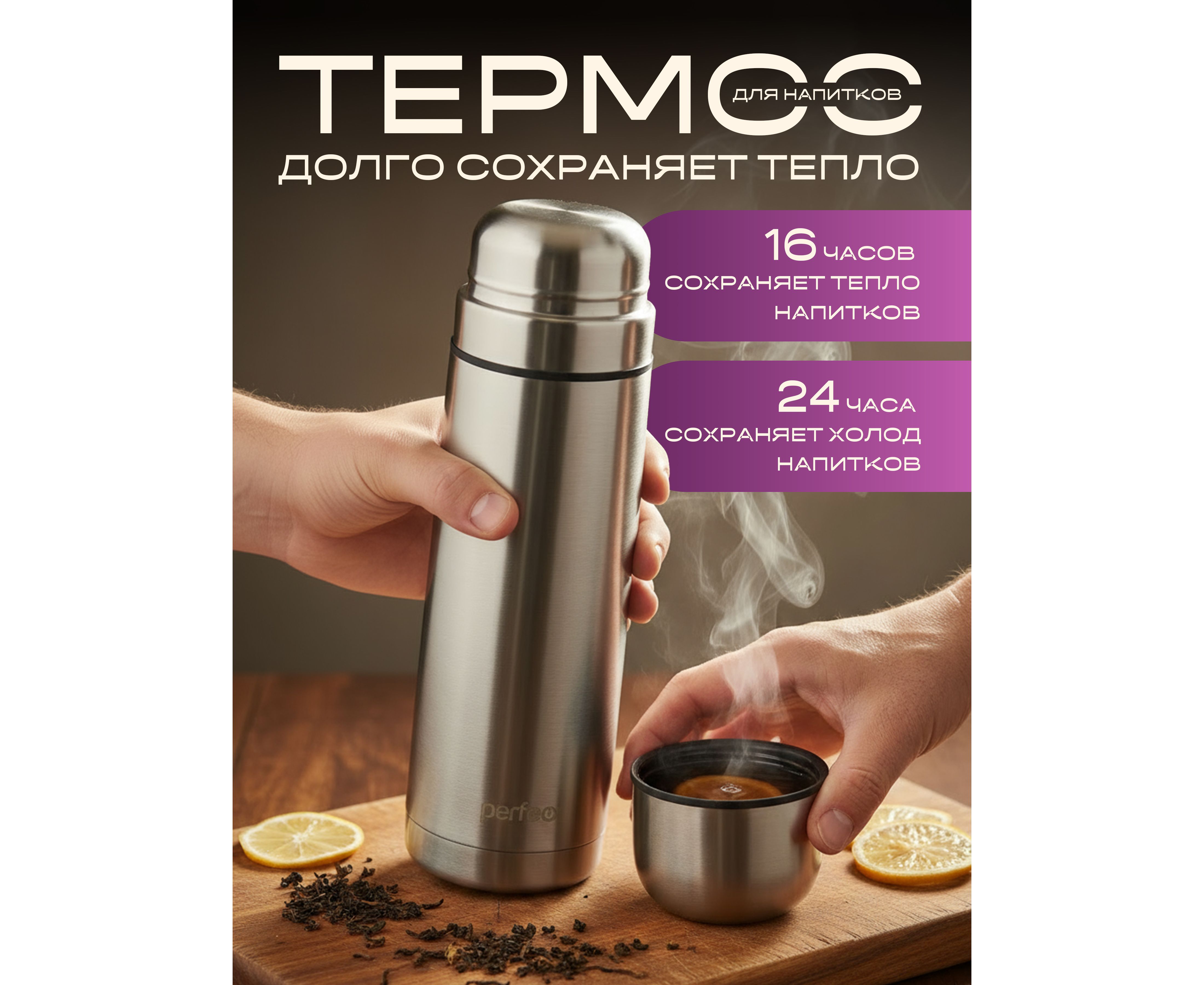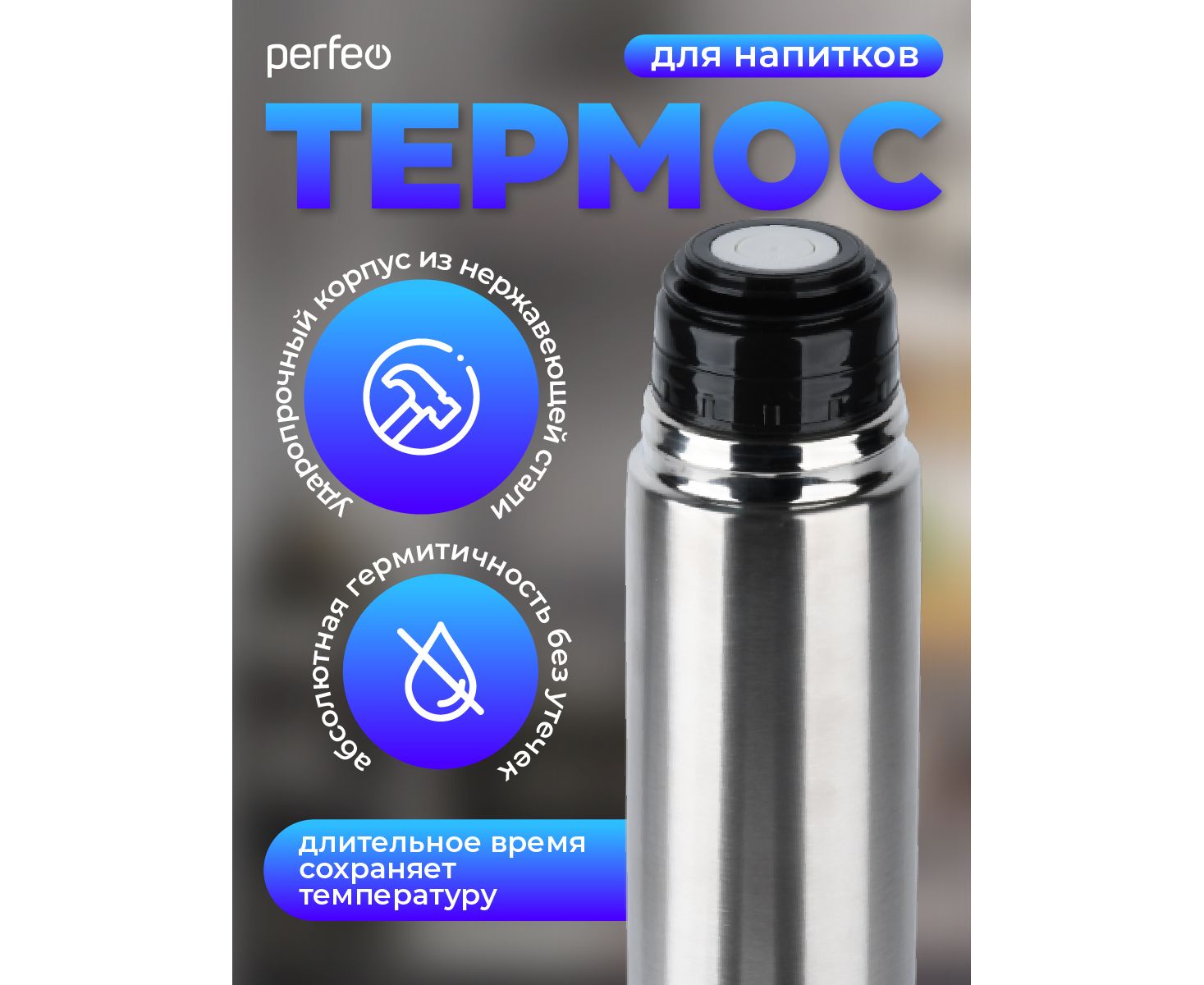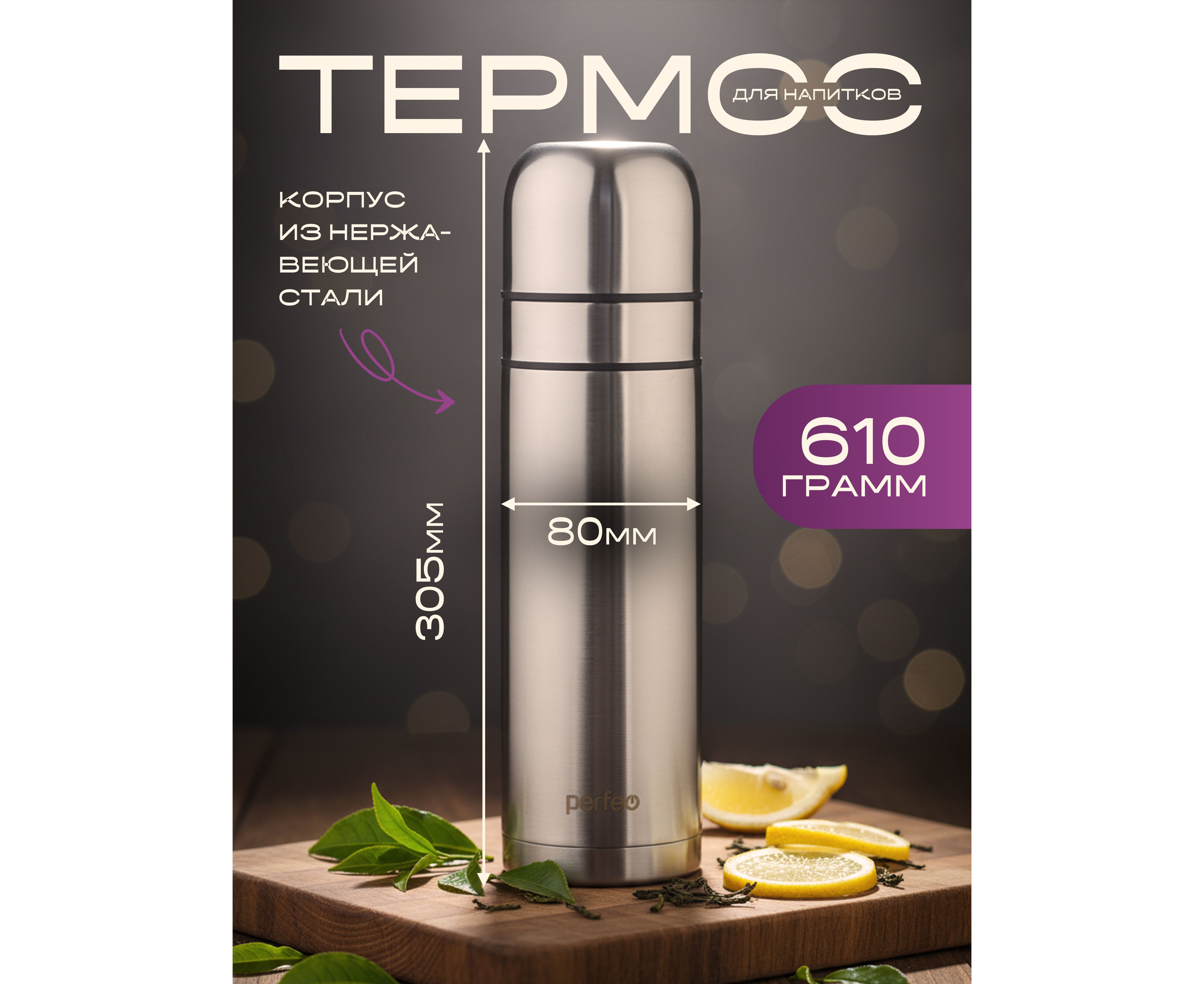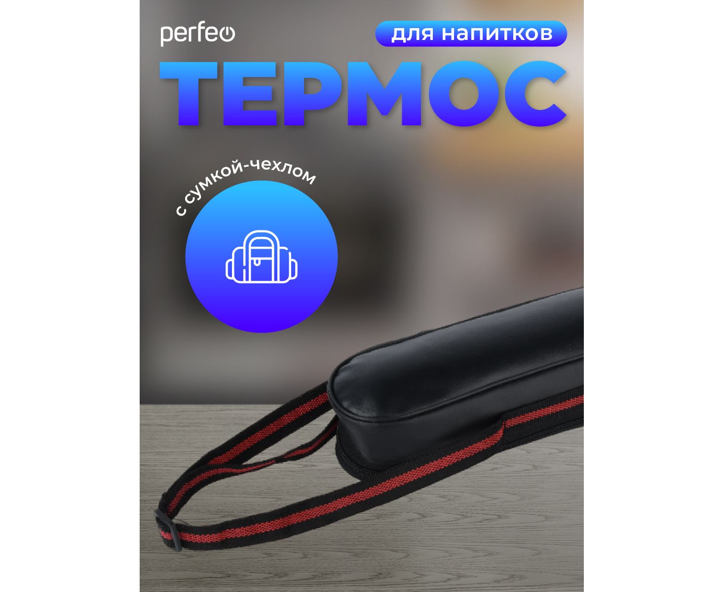 Термос для напитков PERFEO с пробкой-кнопкой, сумкой, объем 0,75 л., нержавеющая сталь, (Арт. PF_E1365)