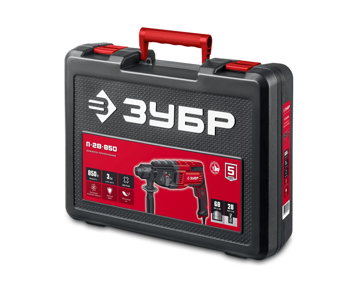 ЗУБР Перфоратор SDS Plus 28 мм, 850 Вт П-28-850 оптимальное изделие в категории простых и производительных перфораторов для быстрого и производительного бурения отверстий до 28 мм и долбления бетона, а также сверления отверстий в металле и дереве. Лучшее соотношение цена-производительность и проверенная временем конструкция.