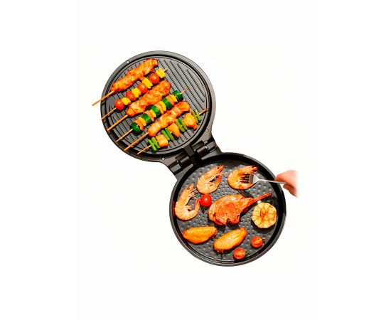 Рабочая поверхность выполнена из безопасного антипригарного покрытия. Можно готовить два разных блюда на верхней и нижней панели одновременно. Также сковороду можно использовать в закрытом виде, получая равномерное запекание, благодаря двустороннему нагреву и использовать функцию гриль. Рабочие области легко очищаются, достаточно просто протереть их губкой, конструкция верхней рабочей области оснащена желобом для стока масла в нижний поддон. В комплекте идет переходник для розеток.