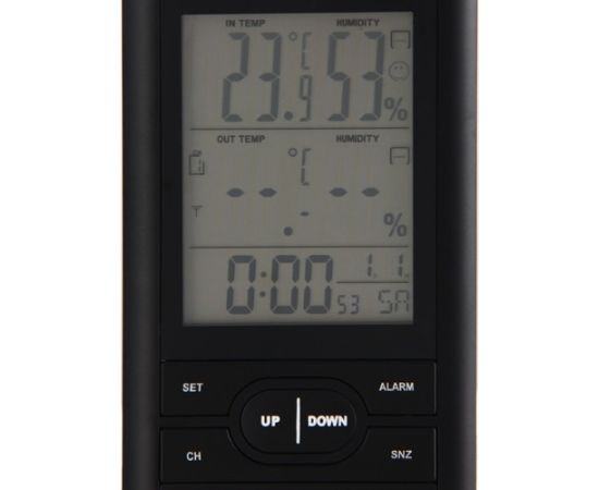 Под экраном находится панель управления, представляющая собой кнопки с обозначениями. Помимо информирования о комнатном и уличном климате устройство можно использовать в качестве будильника. Метеостанция VITEK VT-3532 BK подходит для расположения на горизонтальной поверхности, поскольку имеет откидную подставку. Источником питания служат две батарейки типа AAA. Корпус изготовлен из пластика, отличающегося прочностью.