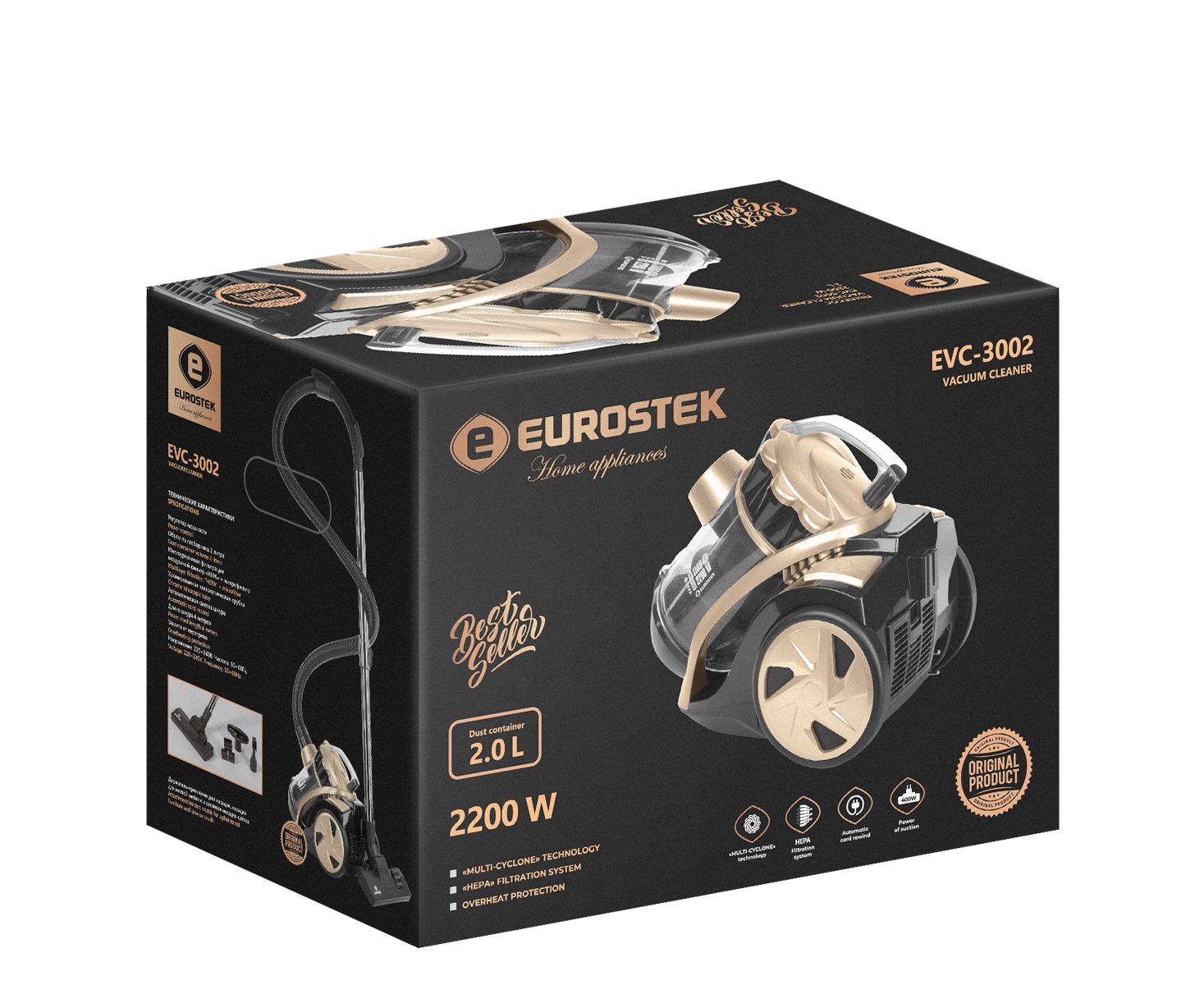 Пылесос МУЛЬТИ-Циклон Eurostek EVC-3002. Многоступенчатая система фильтрации. Внутренний ХЕПА фильтр, внешний ХЕПА фильтр. Максимальная мощность 2200 Вт., мощность всасывания 400 Вт., телескопическая металлическая трубка 80 см, щетка для пола 2 в 1: пол/ковер, щелевая насадка-щетка в комплекте, объем пылесборника 2 литра, индикатор заполнения пылесборника, длина шланга 150 см, длина шнура 4 м, защита от перегрева, автоматическая смотка шнура