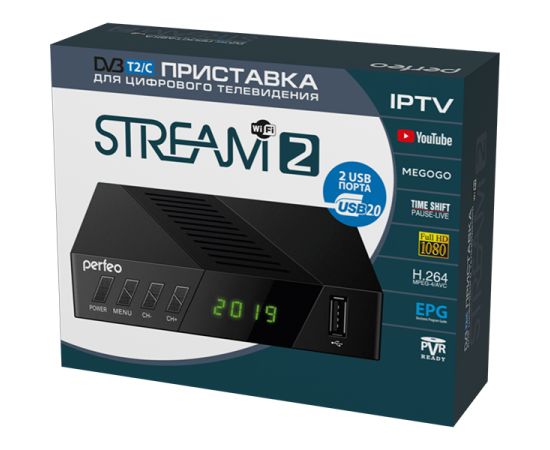 Ресивер DVB-T2 Perfeo "STREAM-2" PF_A4488 черный DVB-T, DVB-T2, IPTV через Wi-Fi адаптер (адаптер в комплект не входит)