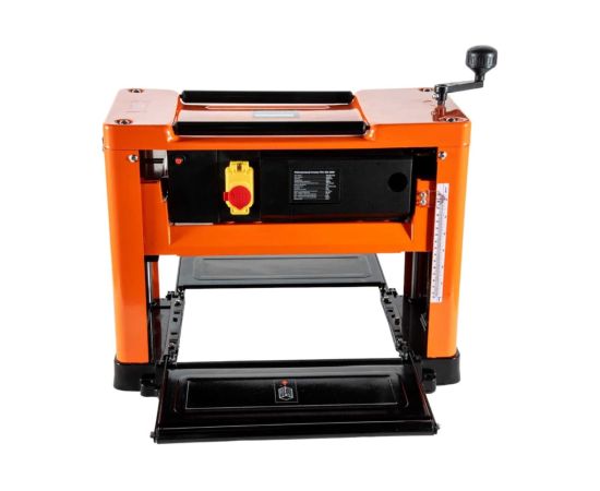Безопасность работы обеспечивается многосекционной зубчатой защитой от обратного удара при рейсмусовании по всей рабочей ширине станка. Автоматическая подача заготовки со скоростью 8,5 метров в минуту увеличивает производительность труда, процесс обработки осуществляется значительно быстрее. Два ножа из быстрорежущей стали вращаются со скоростью 8000 об/мин, что гарантирует высокое качество обработки.