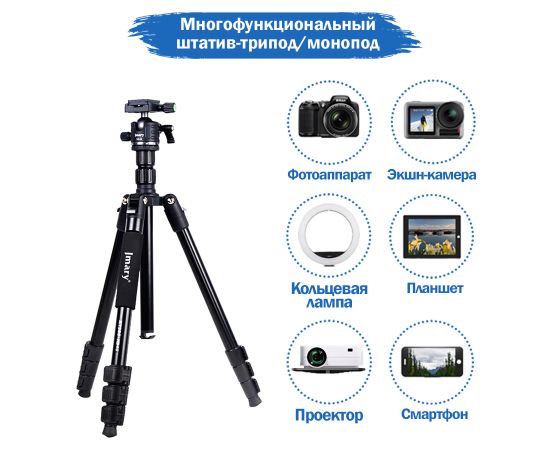 Штатив 2-в-1 1,64 м с панорамной шаровой головкой *Черный цвет * Упаковка включает: штатив * 1, сумка для переноски * 1 * Максимальная рабочая высота: 164,5 см *Минимальная рабочая высота: 42,5 см * Высота в сложенном виде: 45 см * Максимальная нагрузка: 4 кг * Вес: 1,4 кг