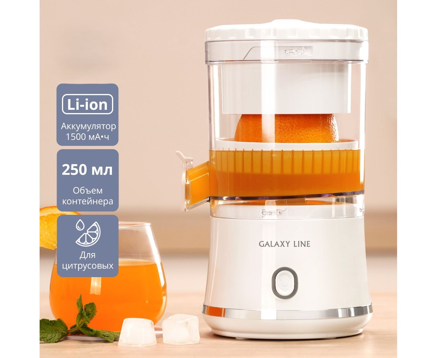 Компактная аккумуляторная соковыжималка GL0855 позволяет легко и быстро получить натуральный свежевыжатый сок из цитрусовых, мягких фруктов и ягод. Вращение конуса активируется одним нажатием кнопки и позволяет получить сок за считанные секунды, оставляя жмых в прессе. Прибор полностью портативный и заряжается от USB шнура, что позволяет использовать его в любом месте и в любое время.