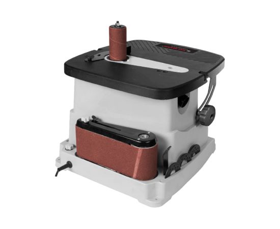 Ленточный узел имеет два обводных ролика разного диаметра, вокруг которых можно работать с вогнутыми поверхностями и прямой участок с металлической подложкой для плоских деталей из дерева. Движение ленты также происходит с осцилляцией, что повышает производительность и качество шлифования. Небольшие габариты и вес обеспечивают легкость размещения станка, а также рациональное хранение и транспортировку. В основании станка расположены ложементы для хранения всей оснастки.