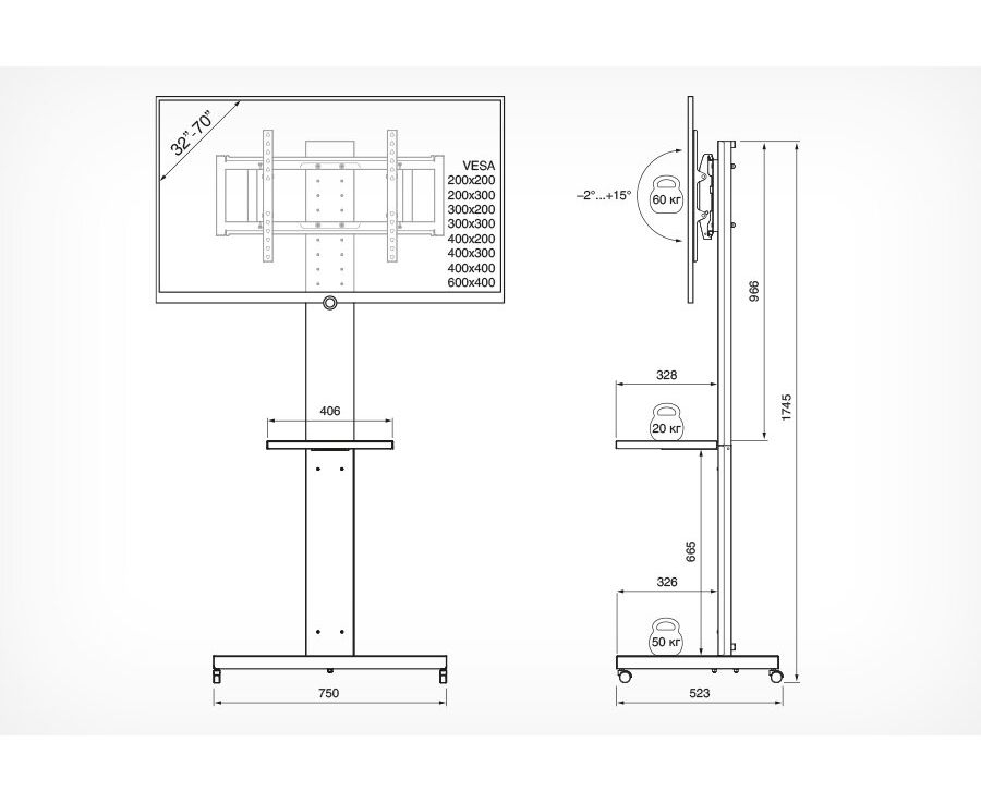 Мобильная стойка для ТВ и аудио- видеоаппаратуры, которая идеально подойдет как для домашнего использования, так и для офисов, торговых центров и спортивных сооружений. Кронштейн на стойке регулируется в 7 положениях по высоте с шагом в 5 см для удобного расположения ТВ.