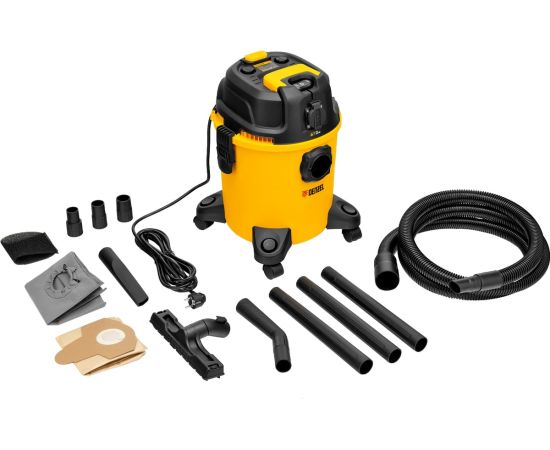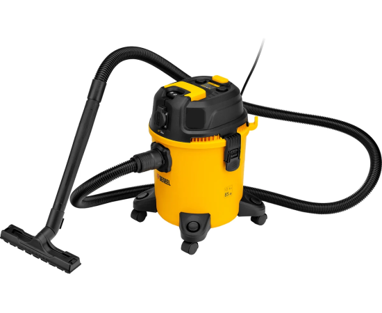 Пылесос строительный Denzel RVC20 28202 мощностью 1400 Вт, с баком объемом 20 л и шлангом длиной 3 м, оснащен розеткой с автосинхронизацией и предназначен для уборки бетонной, кирпичной пыли, опилок, стружки и других твердых отходов.