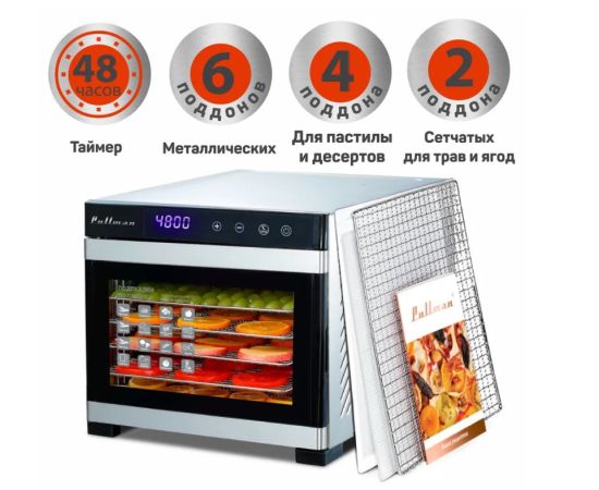 В комплекте 12 поддонов: 6 поддонов из нержавеющей стали, 4 поддона для пастилы и десертов, 2 сетки для трав и мелких продуктов. Книга рецептов в комплекте!