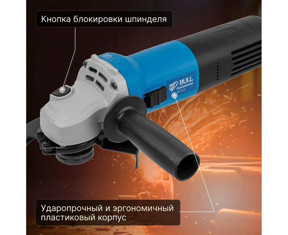 Угловая шлифмашина BULL WS 1207 329010 оснащена мощным пылезащитным двигателем, благодаря этому обеспечивается высокая производительность и долгий срок службы.