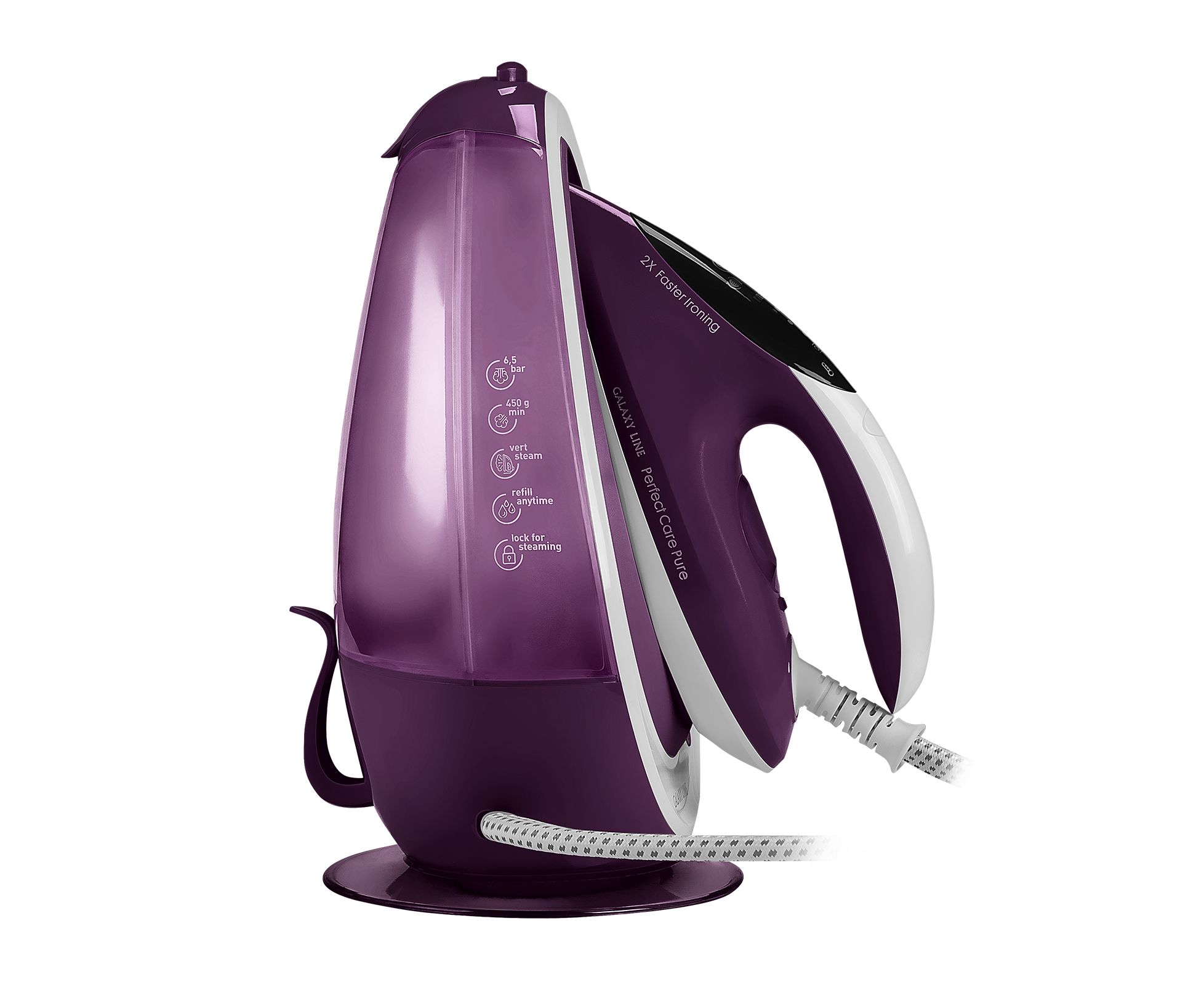В комплекте: утюг, база, мерный стакан, запасной сменный фильтр для сбора накипи, руководство по эксплуатации