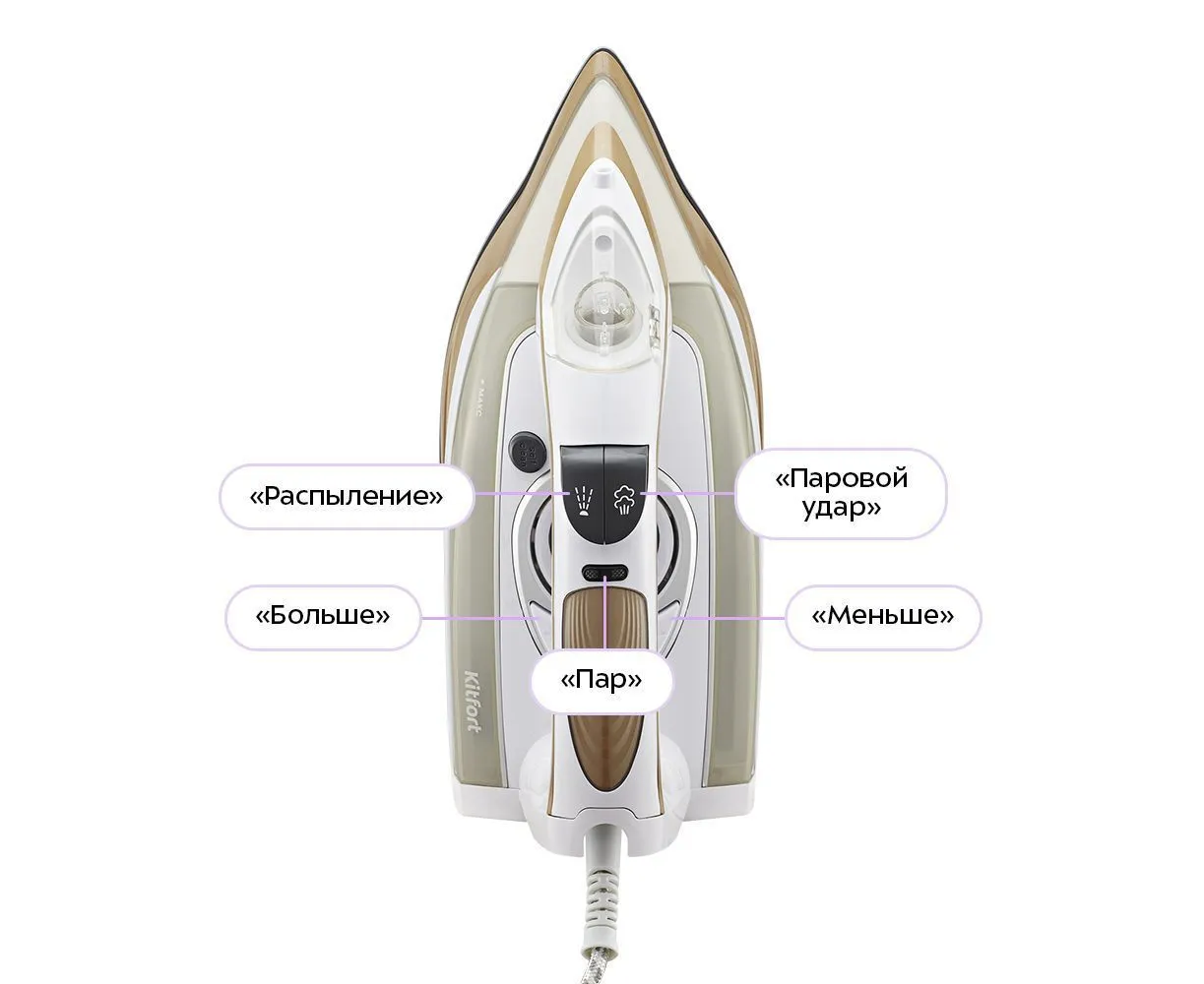 Управление утюгом интуитивное: две кнопки «Больше» и «Меньше» для включения, регулировки уровня нагрева и отключения. Отдельные кнопки «Пар» и «Паровой удар» отвечают за постоянную подачу пара и функцию усиленного удара