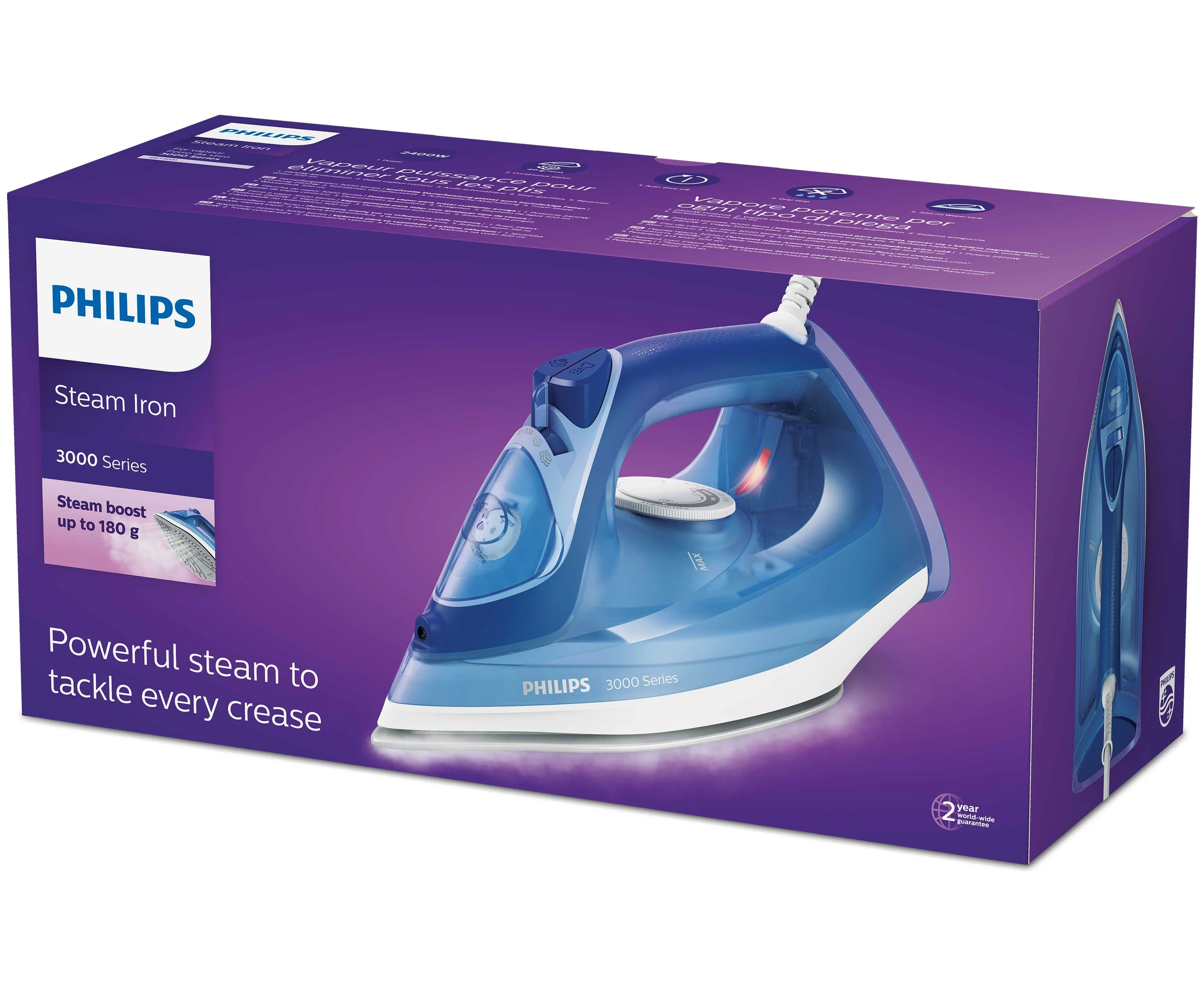 Паровой утюг серии 3000 позволяет легко разглаживать даже жесткие складки благодаря мощной подаче пара. Керамическая подошва обеспечивает гладкое скольжение, а резервуара для воды 300 мл хватит для глажения небольшой стопки вещей даже без пополнения.