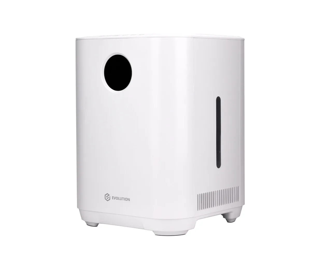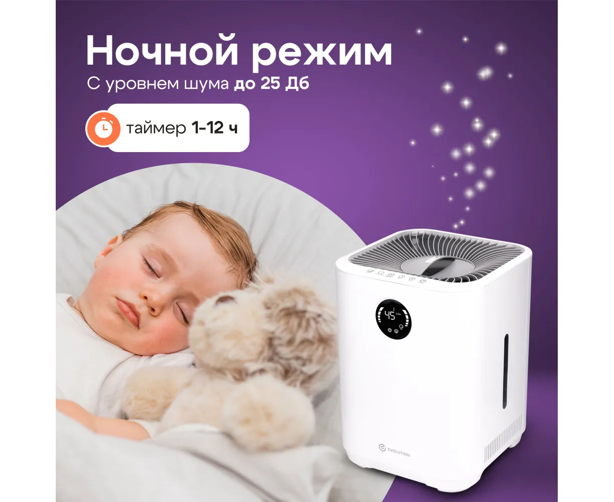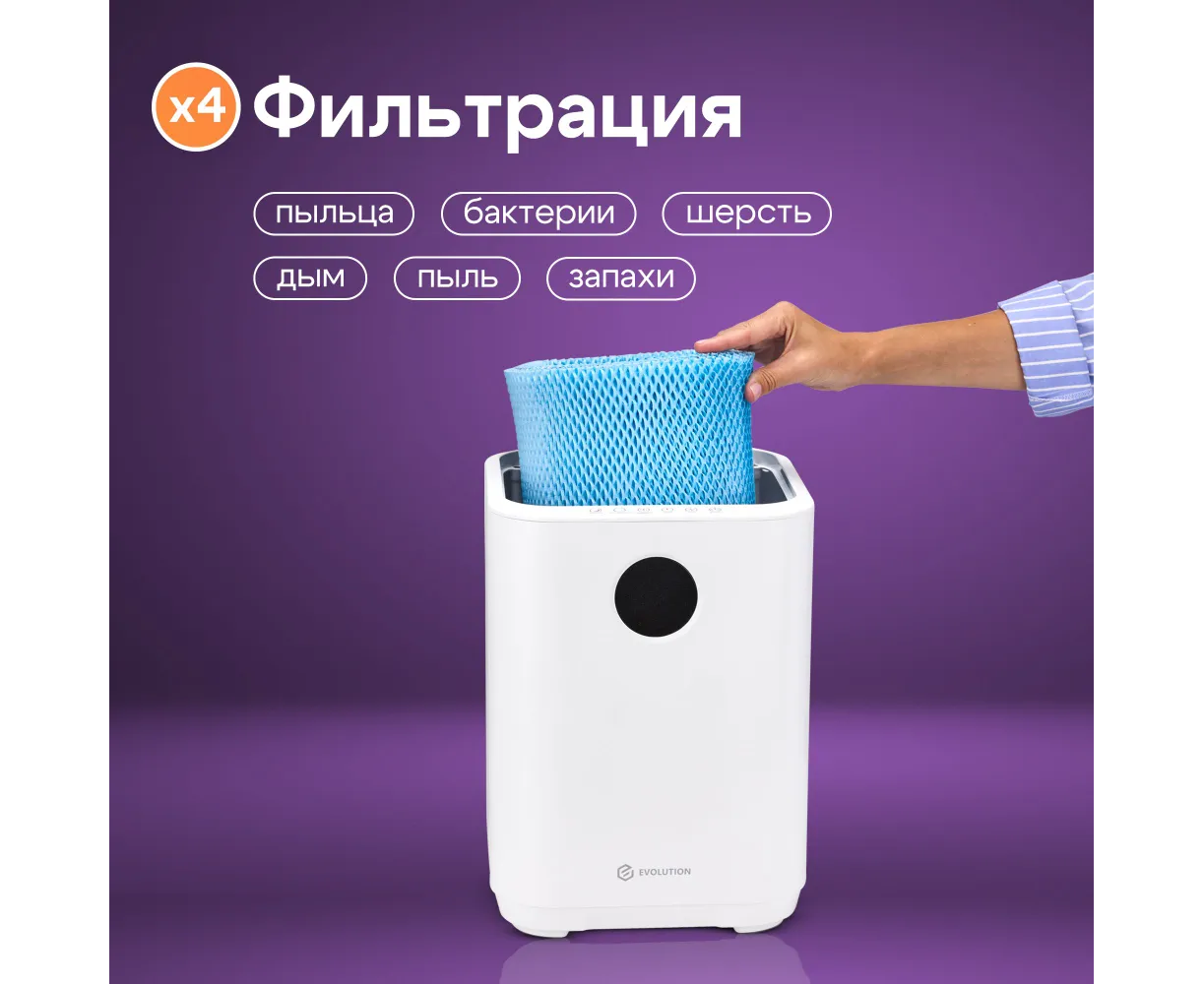 Увлажнитель воздуха для дома EVOLUTION SmartAir Evaporative Pure HF-577 Smart основан на принципе естественного испарения. Его конструкция оснащена встроенным вентилятором, который при работе устройства забирает сухой воздух и пропускает его через влажный фильтр, что ускоряет процесс насыщения воздуха влагой и способствует повышению уровня влажности в помещении. Фильтр задерживает мелкую пыль, известь и другие вещества из воздуха и воды, тем самым очищая их и распыляя увлажненный воздух. Ультрафиолетовая лампа стерилизуют воду, уничтожая бактерии и вирусы. Благодаря этому вода не «цветет» и не источает неприятный запах. Функция ионизации создает отрицательные ионы, которые заставляют плавающие в воздухе частицы (пыль, шерсть домашних животных, аллергены) слипаться и падать на пол.