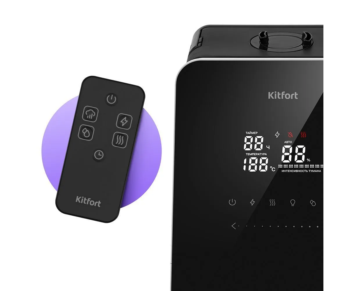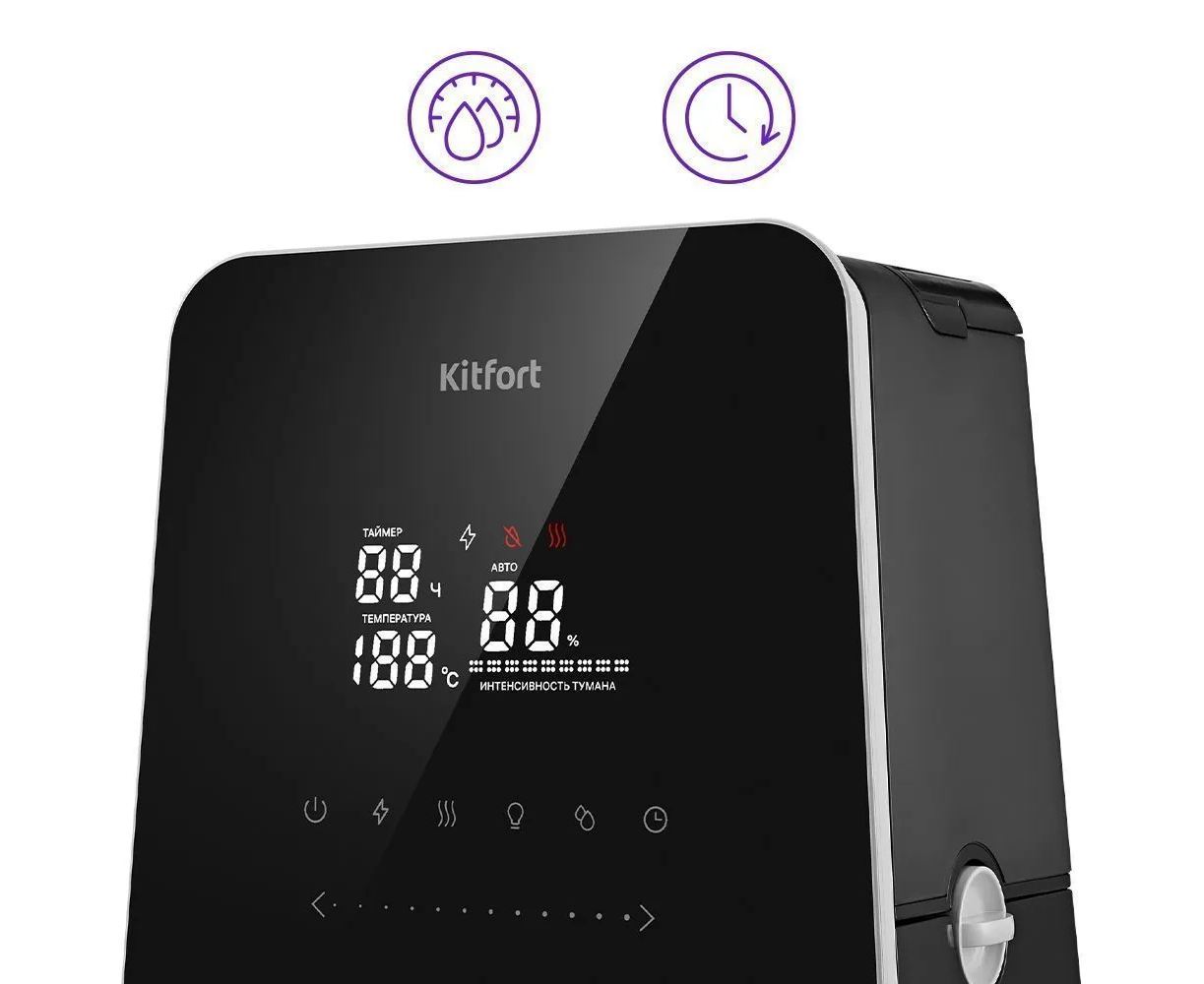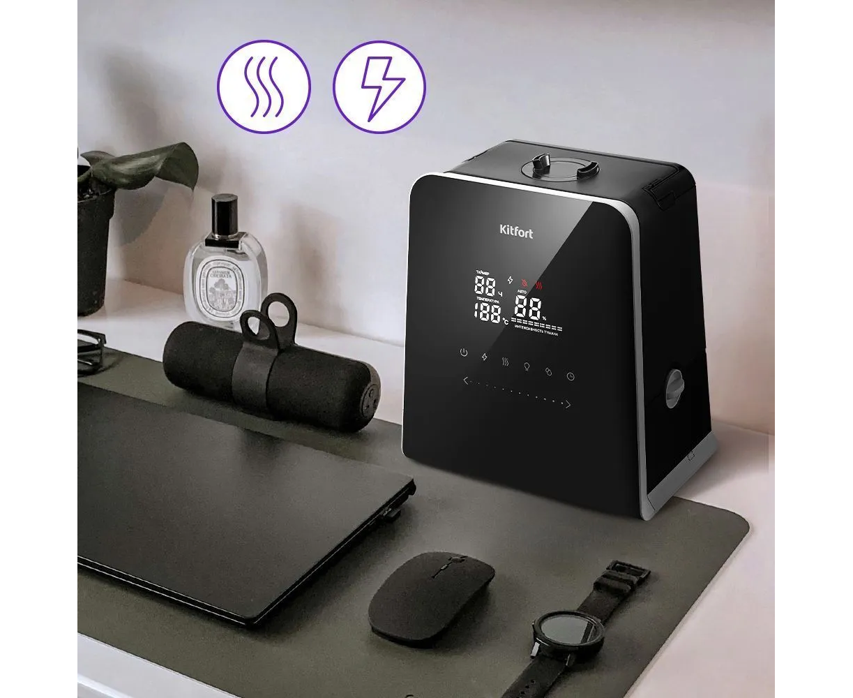 КТ-3823 имеет функции «Подогрев» и «Ионизация». Ионизация – процесс наполнения помещения отрицательно заряженными ионами воздуха, который очень полезен для организма человека. Подогрев воды и подача тёплого тумана позволяет быстрее увлажнить воздух.