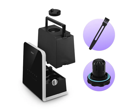 Простая конструкция, которая позволяет легко разбирать и чистить увлажнитель. В комплекте к прибору есть щёточка для очистки деталей.