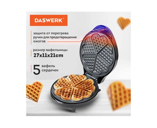 Электровафельница DASWERK WM-7 с мощностью 1200 Вт – ваш идеальный помощник для приготовления разнообразных вафель-сердечек. Будь то венские вафли, бельгийские, овощные или сырные, эта вафельница справится с любой задачей. Антипригарное покрытие и встроенный нагревательный элемент обеспечивают равномерное приготовление пяти вафель одновременно, что делает использование вафельницы удобным и быстрым.