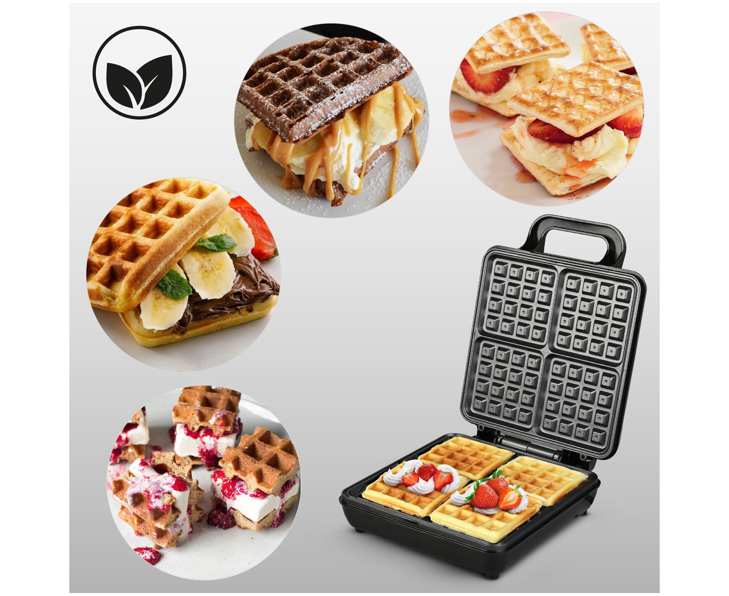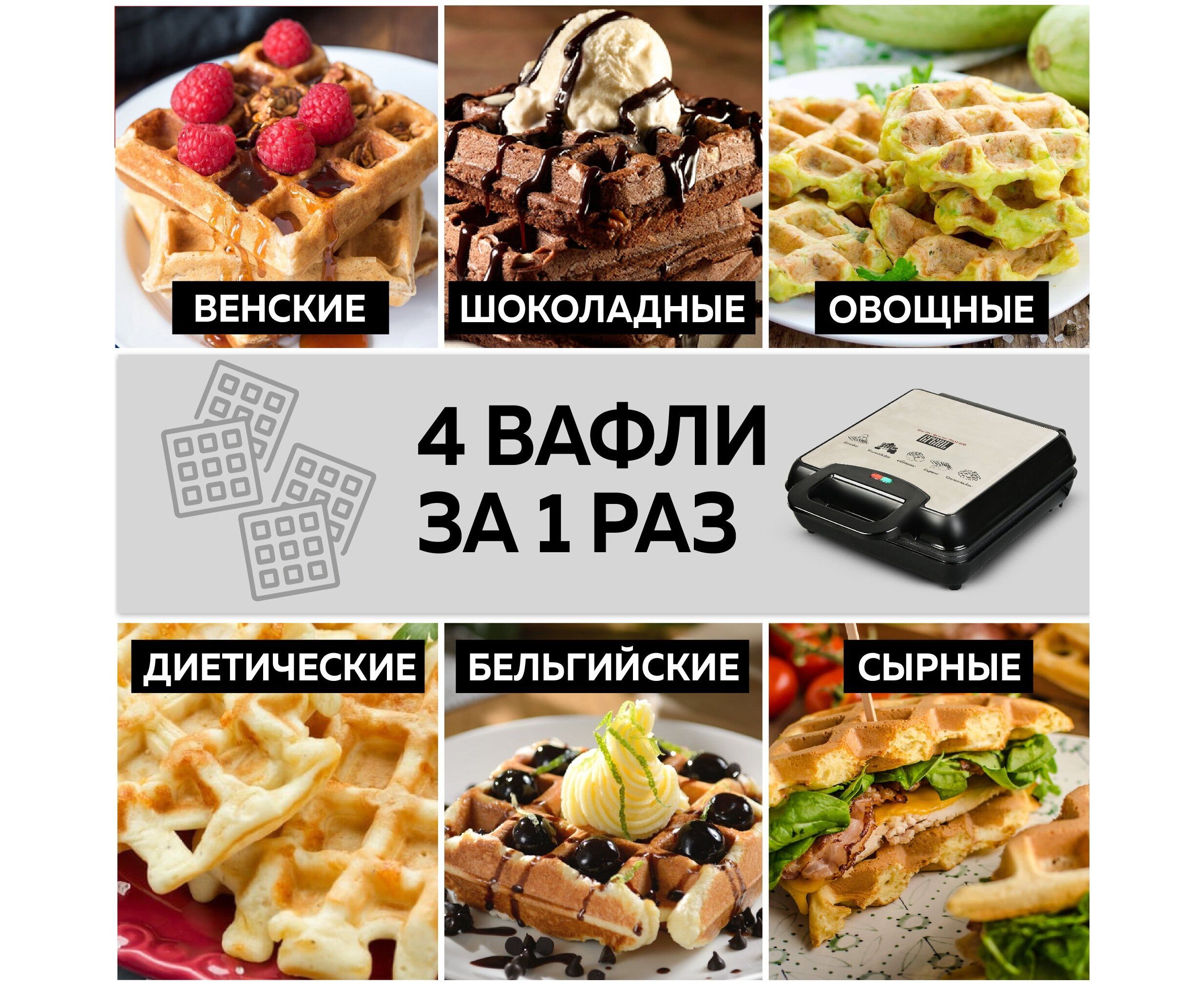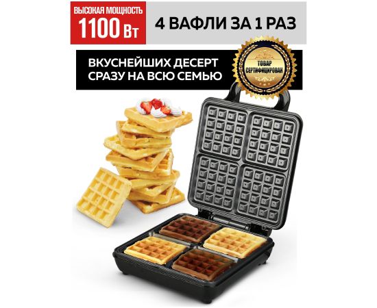 Электрическая вафельница GFW-036 поможет Вам приготовить сразу 4 ароматные, вкусные, хрустящие бельгийские или венские вафли за 1 раз. Тем самым вы экономите Ваше время – всего несколько минут и у вас сразу 4 вкуснейшие вафли или 2 необычных и сытных вафельных сэндвича с Вашей любимой начинкой!