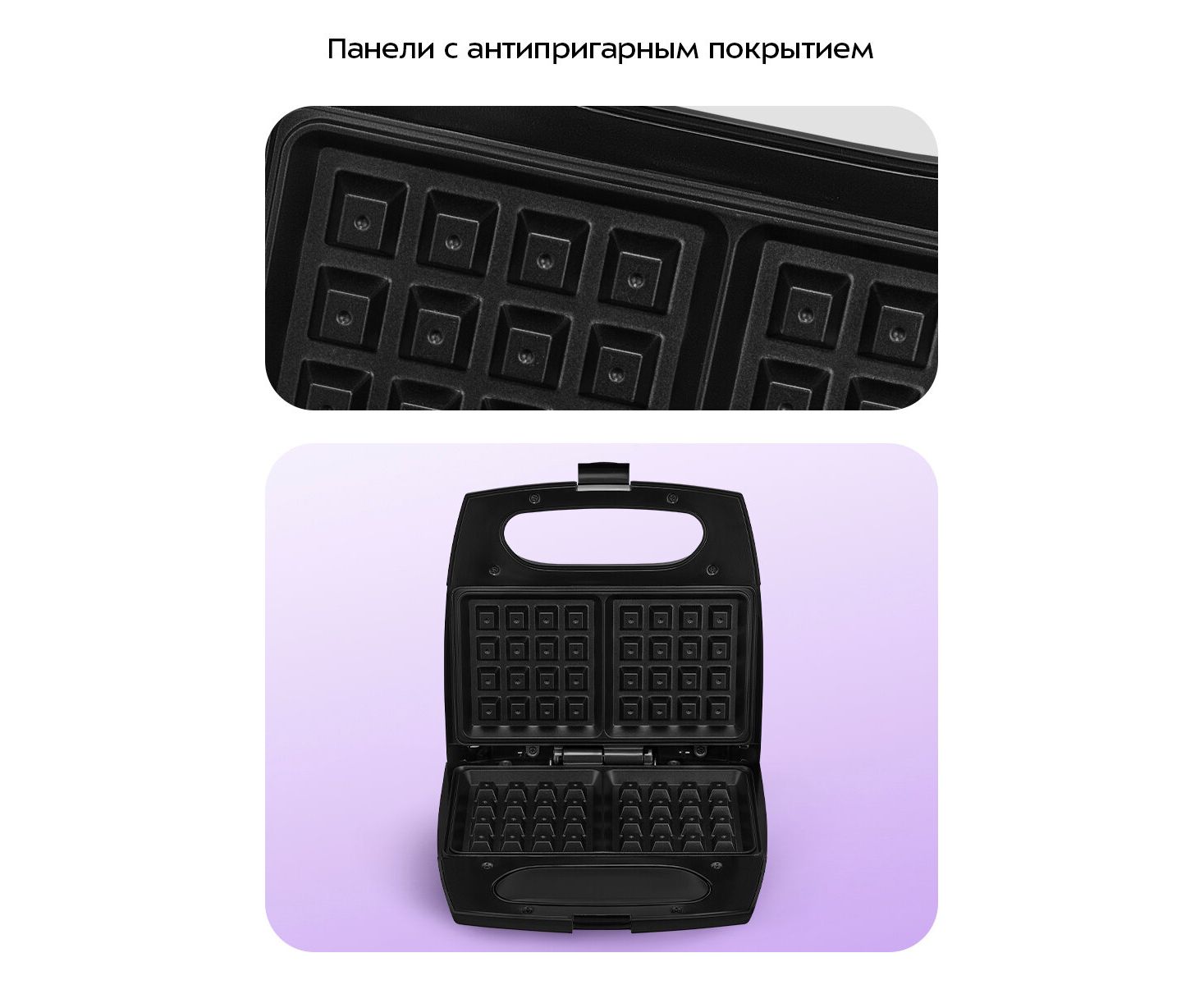 Антипригарное покрытие панелей вафельницы не даёт прилипнуть тесту в процессе приготовления и позволяет готовить с минимальным количеством масла. Также антипригарное покрытие облегчает чистку панелей.
