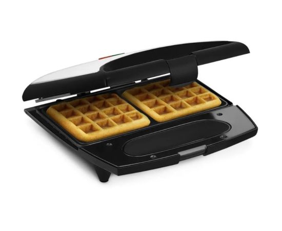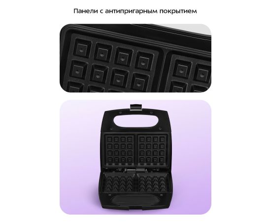 Вафельница оснащена индикаторами питания и нагрева, а также термостатом для поддержания температуры панелей.