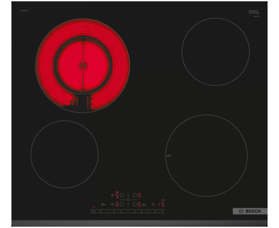 Электрическая варочная панель Bosch PKF631FP3E шириной 60 сантиметров со скошенным краем. Четыре конфорки расположены под стеклокерамикой. Круглая зона расширения 12 и 21 сантиметр позволяет использовать посуду большого диаметра. Режим PowerBoost экономит время при разогревании больших объемов жидкости. Блокировка от детей предотвращает непреднамеренное включения варочной панели.